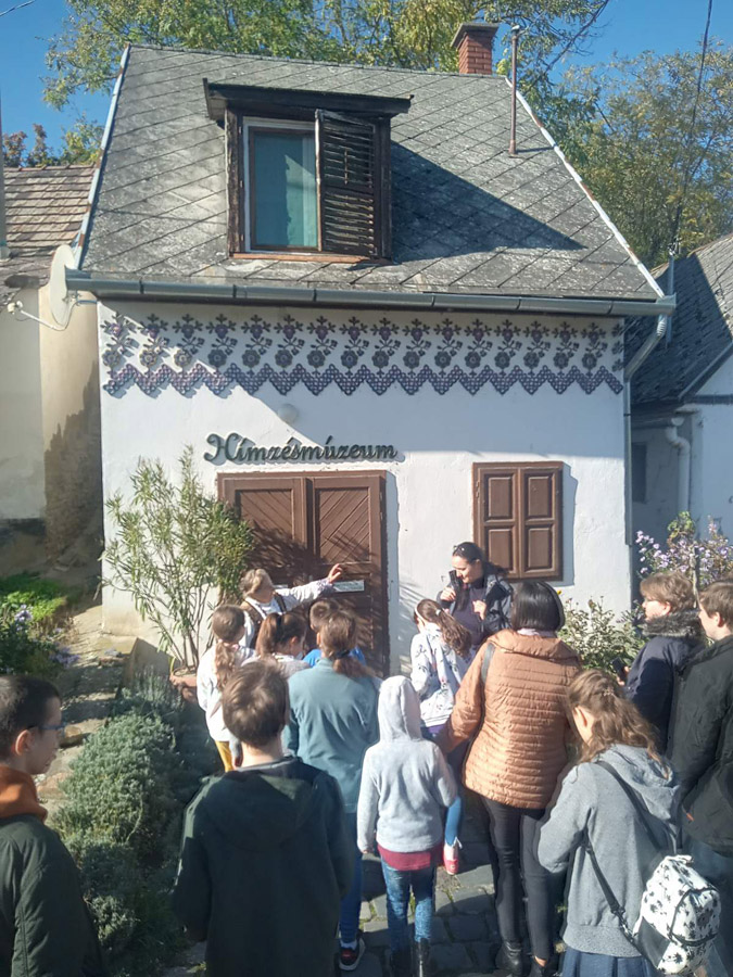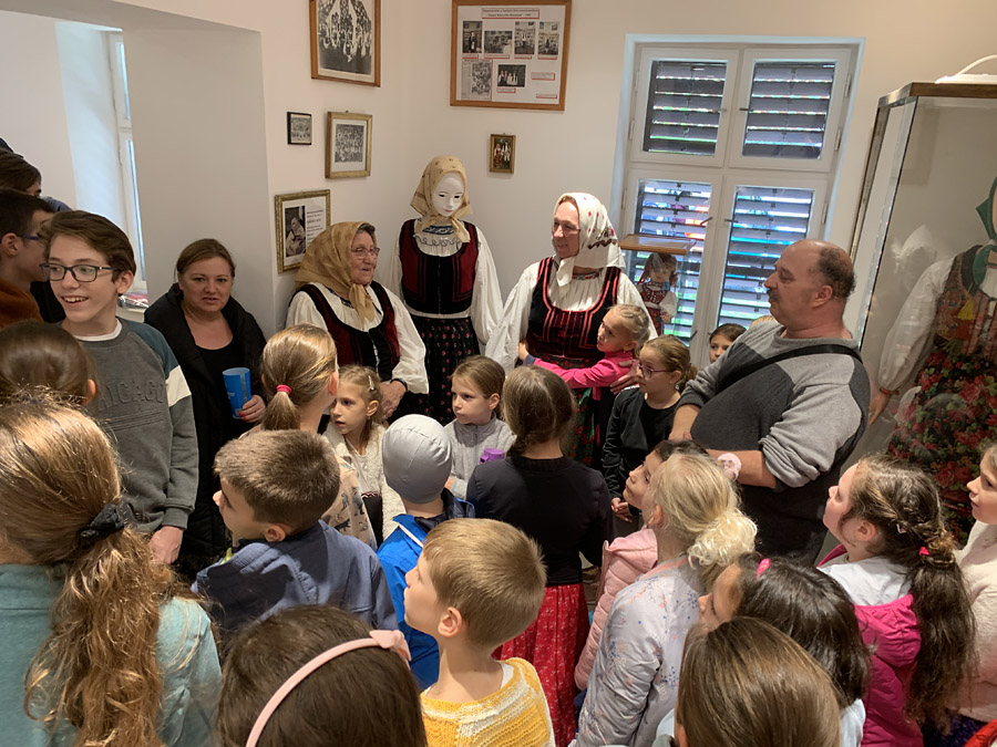 Délután megtekintettük a tájházat, ahol megcsodálhattuk a gyönyörűen hímzett viseleteket és ágyruhákat, a tisztaszoba jellegzetes bútorait, és néhány szokással is megismerkedhettünk. Majd a még Andrásfalván született 87 éves Molnár Sándorné, Zsuzsi néni mesélt nekünk gyerekkori emlékeiről: a vonattal történő visszatelepítésről, majd a hihetetlen menekülésről hidakon, folyókon keresztül „Kis-Magyarországra”. Majd arról, hogyan gyűjtötték őket össze Kakasdon, ahol végül letelepedhettek.